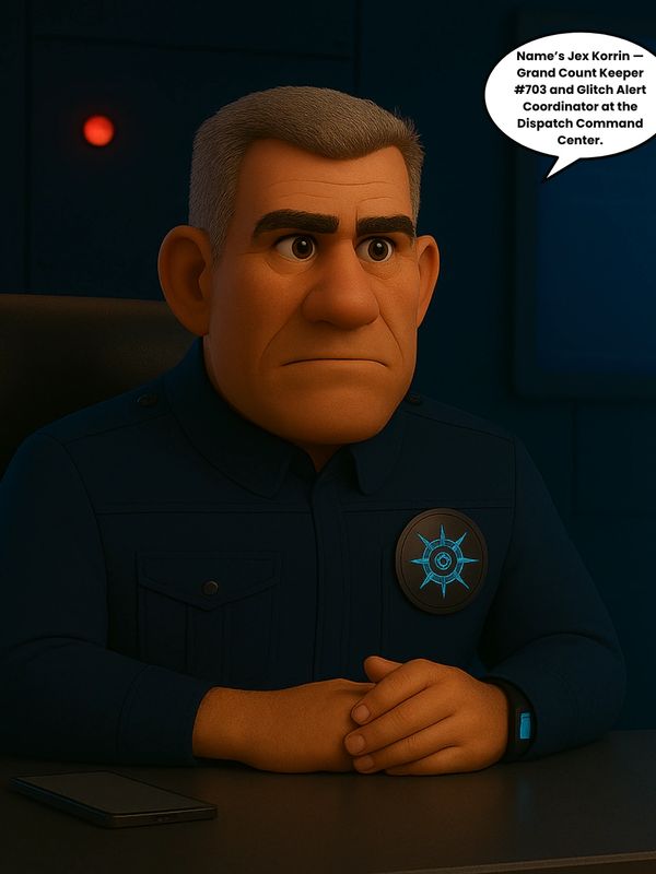 As Grand Count Keeper #703, Jex Korrin oversees the Central Glitch Monitoring Division from the Dispatch Command Center, coordinating Mindora’s rapid-response teams whenever the Phantom’s disruptions threaten the stability of the Realms. His years of service have earned him both respect and responsibility — particularly as the lead voice in issuing Glitch Alerts and directing containment missions.